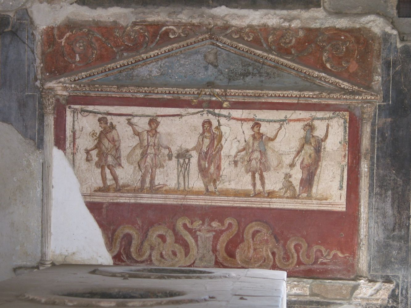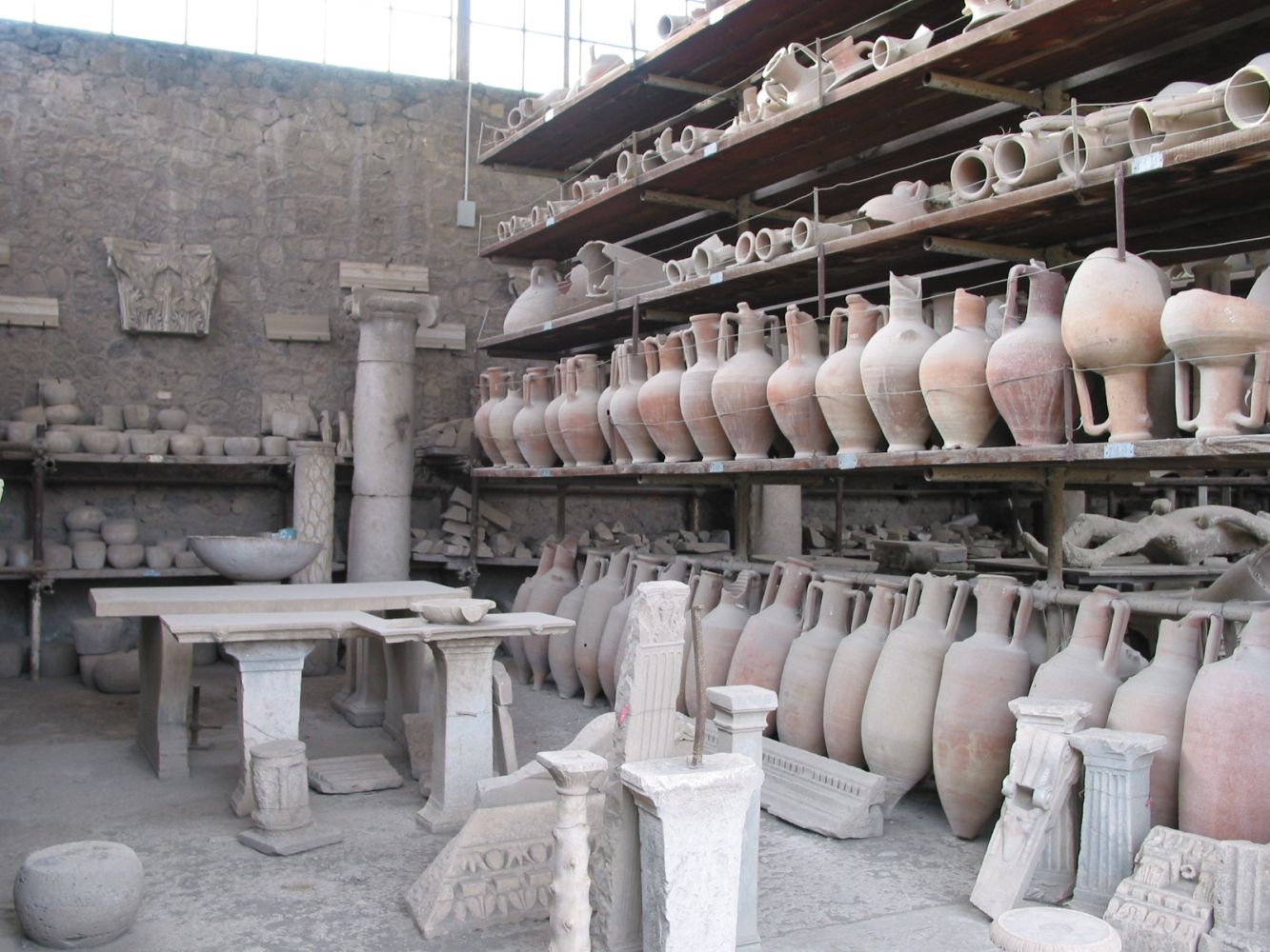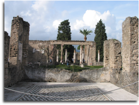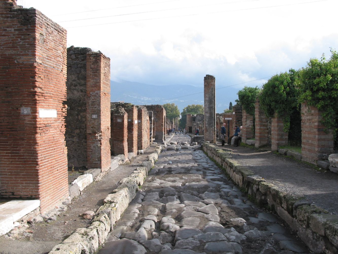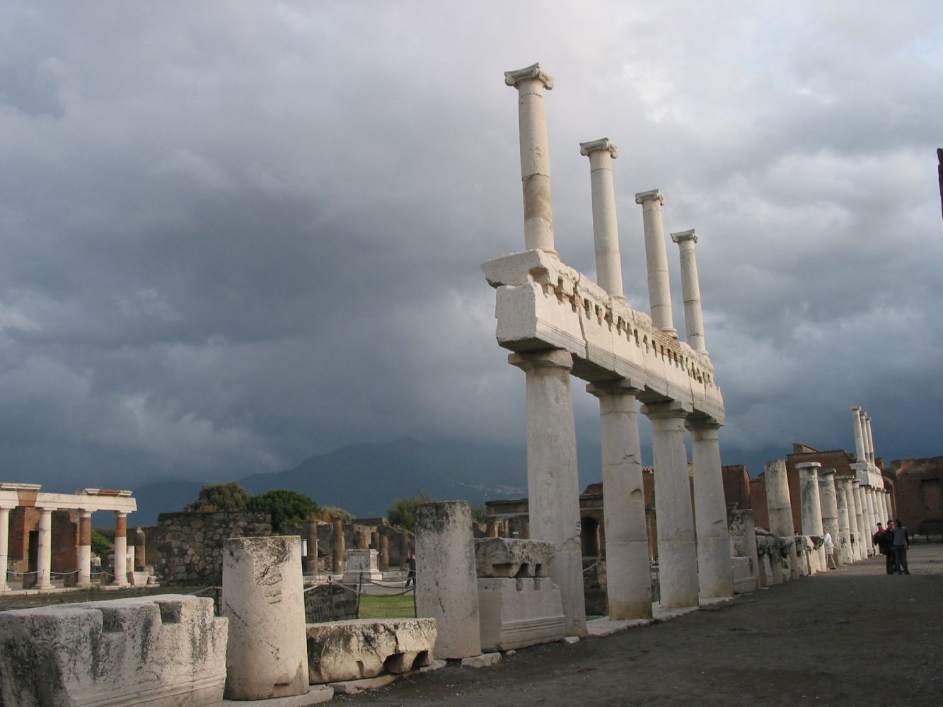 On arrival, I parked the car in one of the many “secure” car parks that skirt the ancient city, (capitalism strikes again!) and headed off into the ruins of Pompeii. It really was like walking into another world. The programme about Pompeii on the BBC last week left a big impression and it was really quite exciting to recognise the places that you had seen “brought to life” on the TV, like the house of Stephanus the fuller and the shops on the main street with their marble counters and inset pottery storage jars. I just walked my feet off over the next four hours or so. It really is quite a surprise just how big Pompeii is, and how much of it is left. I took so many photographs that the camera started complaining that its batteries were running out. The streets, houses, atriums and frescoes were so complete that it was almost like visiting the Marie Celeste, and all the while, the brooding presence of Vesuvius hung over the town with its peak hidden in the clouds as though it was still smoking. I just found the place fascinating, and the stories it told engrossing and so poignant. So many lives lived in these streets and brought so suddenly to an end in a single day nearly 2,000 years ago, and yet here it all was in front of me, at times seeming almost untouched, as though the population had just tiptoed away the day before and left it behind.